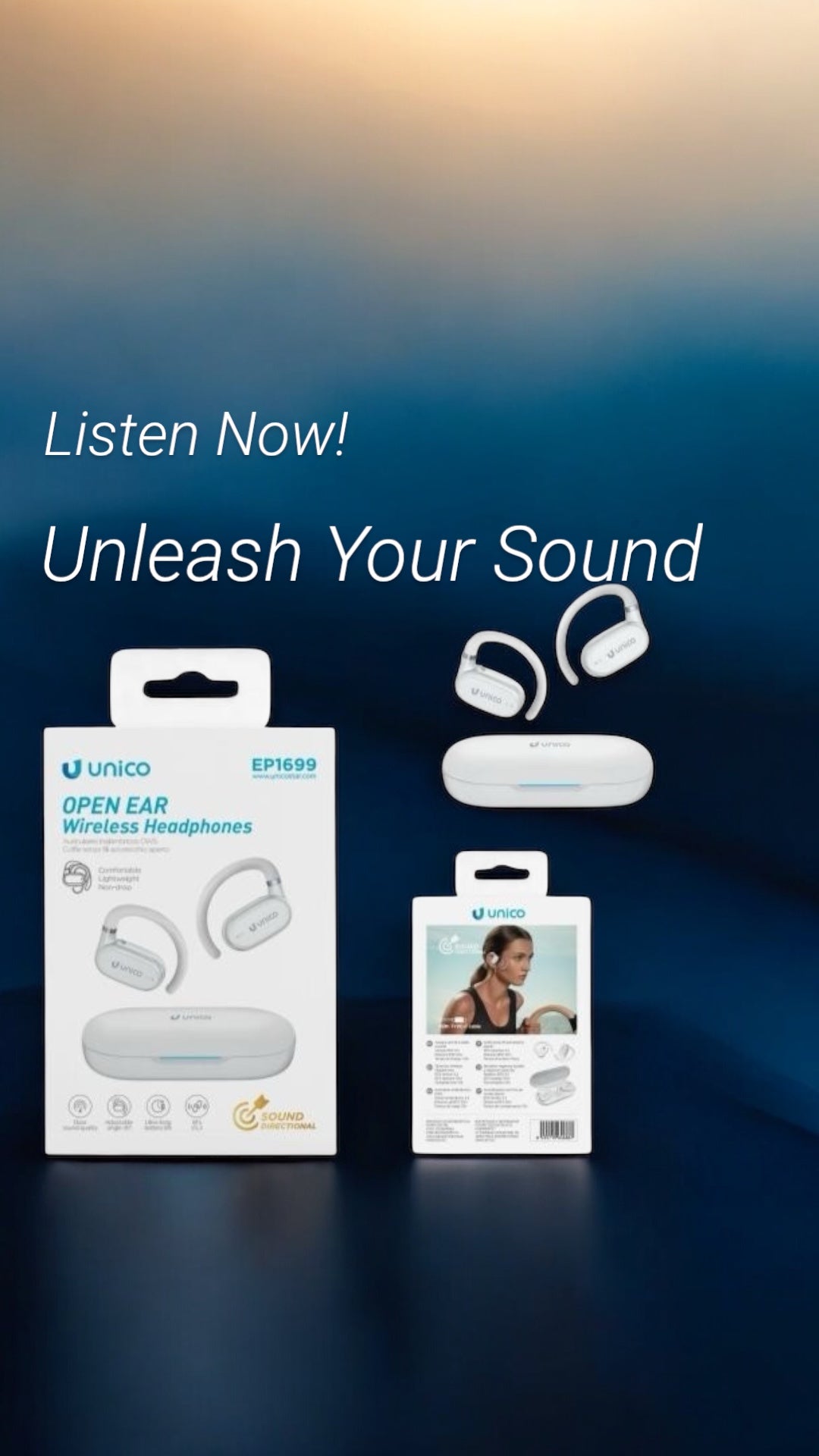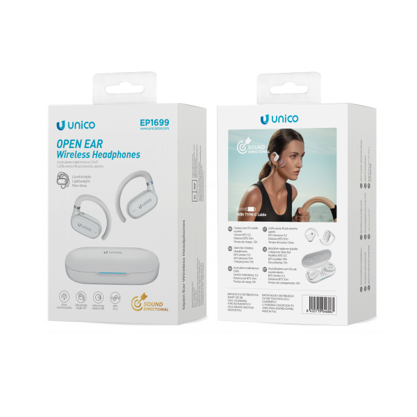 Unico EP1699 Open Ear Wireless Headphones with their charging case.